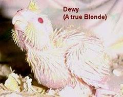 ,a normal grey, Lucy, a lutino and Dewy, a lutino.