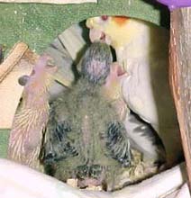 an 18 month old gray pearl, feeding her chicks. Papa Babe,the daddy is a 12 month old lutino