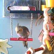 bar and whistle to music. She also perches herself on the top of people's heads.