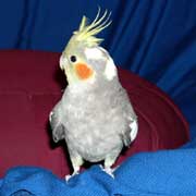 table. Melissa said, "We are new to cockatiels but we are learning. Nibs is our baby and