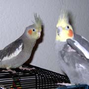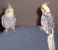 This is Josey and Dosey. Josey, the one on the left is a normal gray cockatiel