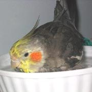 Alfie also likes to perch on your shoulder and play with your hair. Alfie likes taking baths. When I spray him with